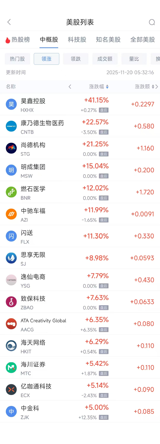 领涨中概股列表: